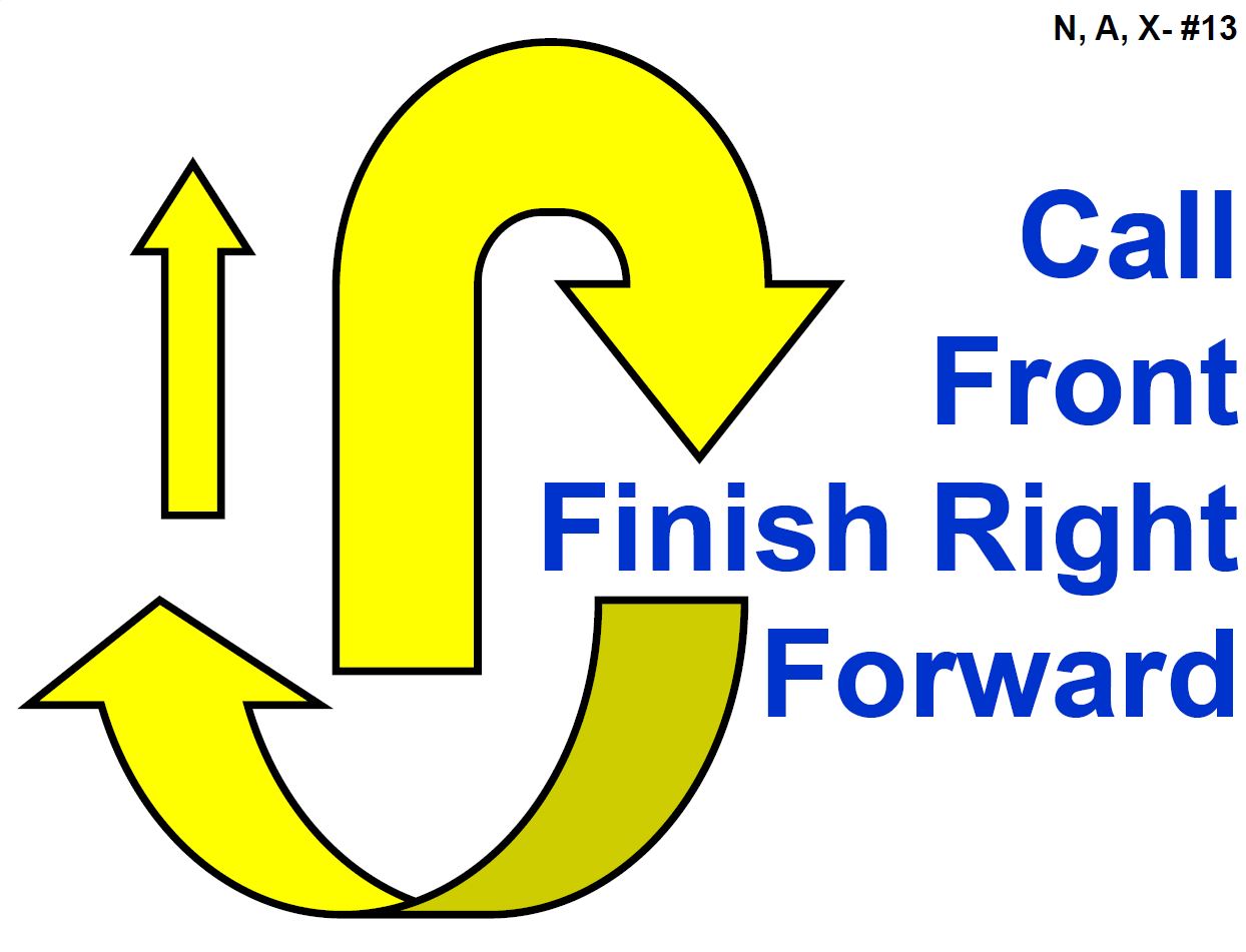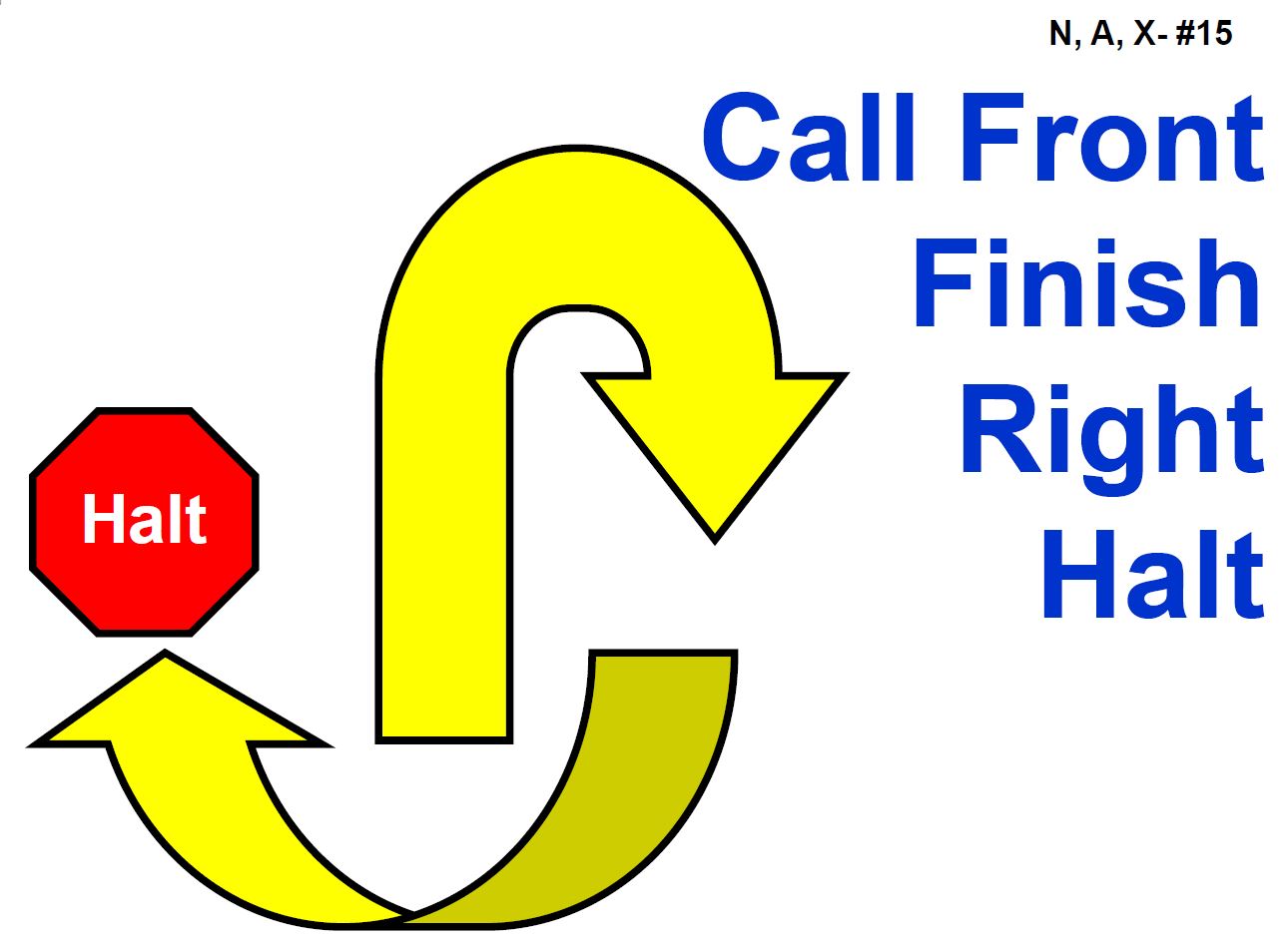 | While heeling, the handler stops forward motion and calls the dog to the front position (dog sits in front and faces the handler). The handler may take several steps backward as the dog turns and moves to sit in the front position.   Second part is the finish to the right, where the dog must return to heel position by moving around the right side of the handler. Dog must sit in heel position before moving forward with the handler. Handler must not step forward or backward to aid the dog as the dog moves toward heel position. (Stationary  Exercise) |