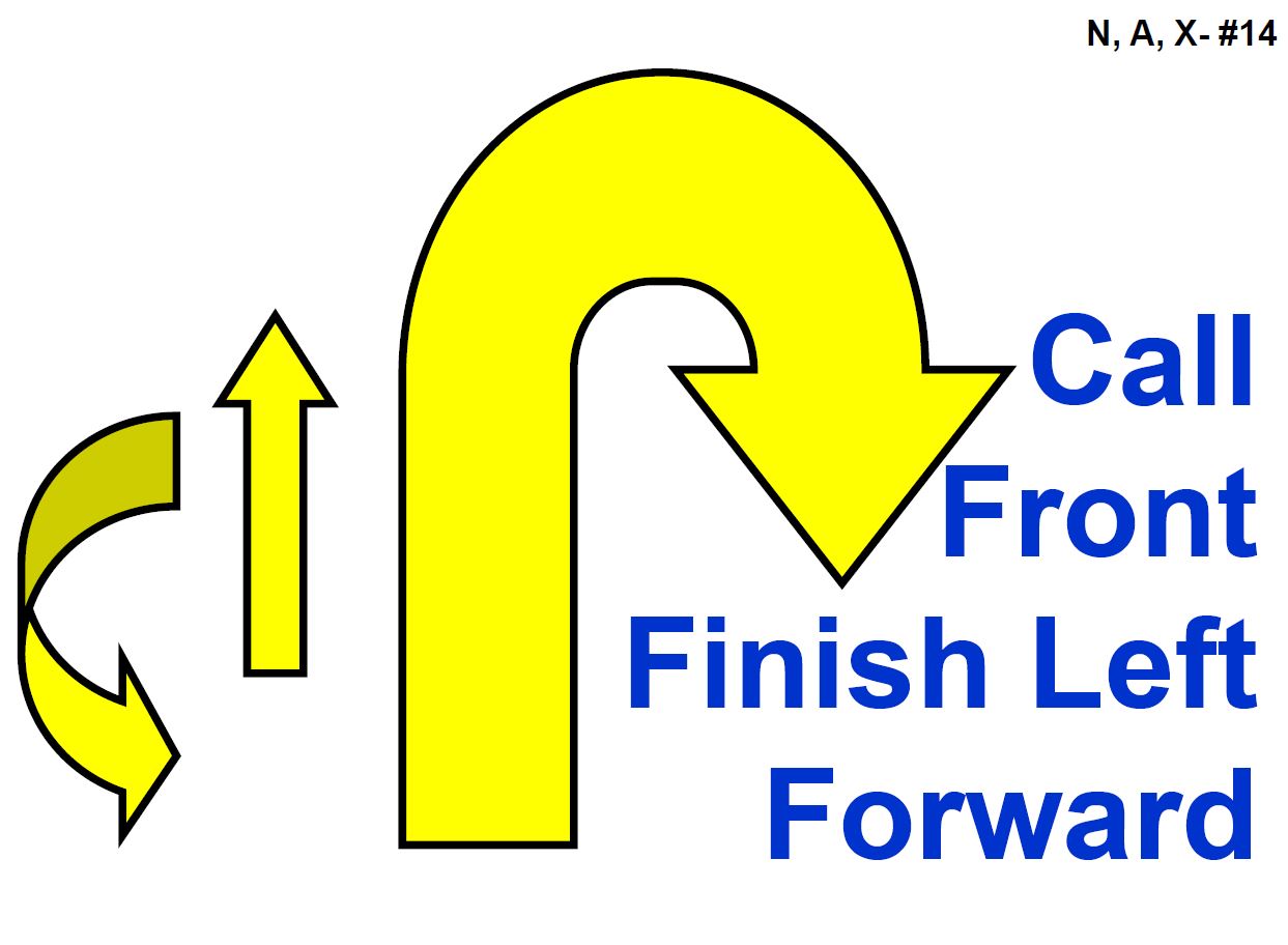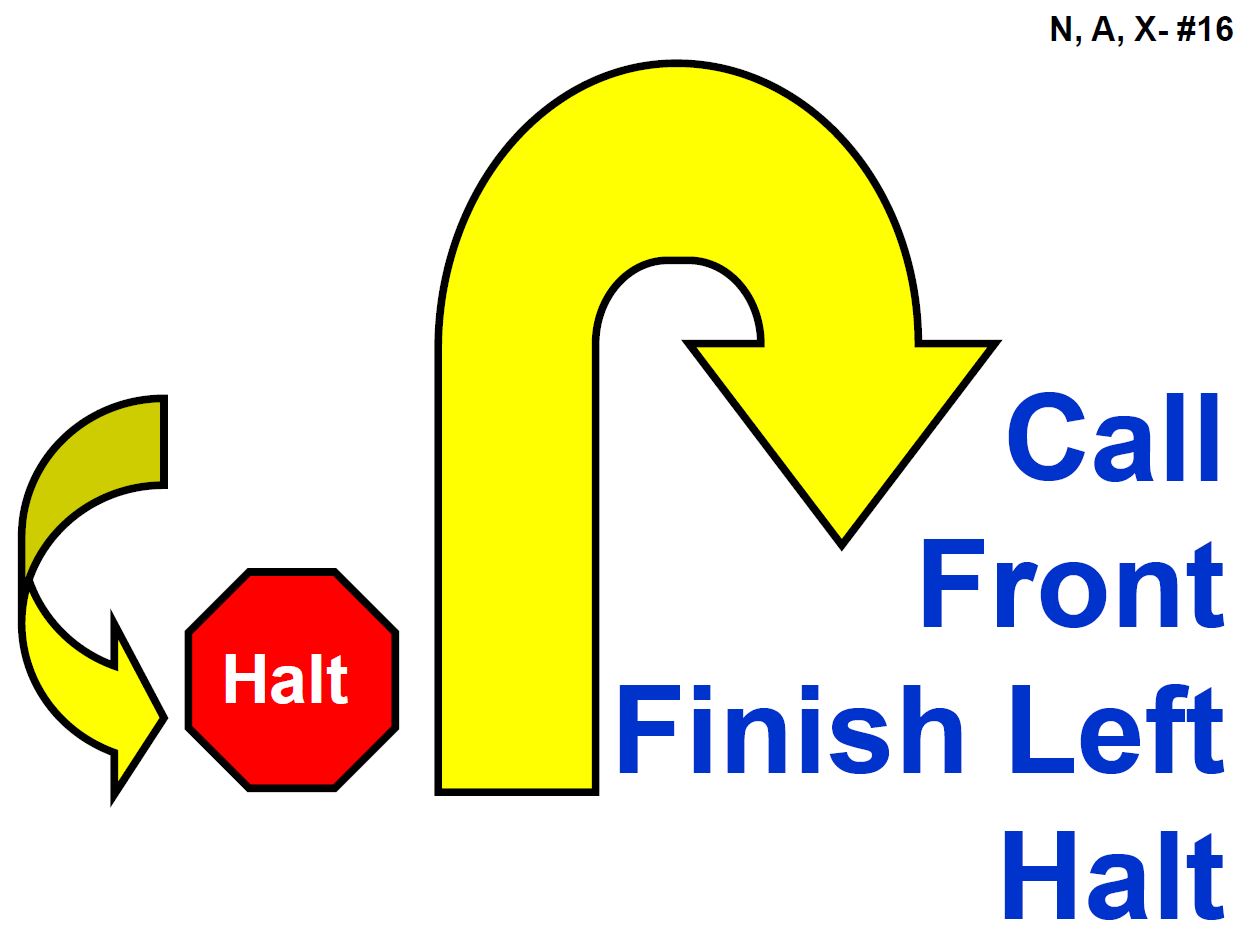 | While heeling, the handler stops forward motion and calls the dog to the front position (dog sits in front and faces the handler). The handler may take several steps backward as the dog turns and moves to a sit in the front position.   Second part is the finish to the left, where the dog must return to heel position by moving around the left side of the handler and sit in heel position. Dog must sit in heel position before moving forward in heel position with the handler. Handler must not step forward or backward to aid the dog as the dog moves toward heel position. (Stationary  Exercise) |