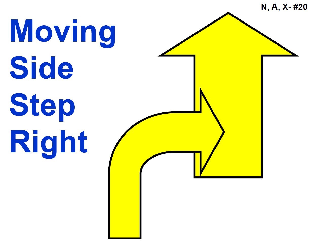 | While heeling, the handler takes one step to the right, leading with the right foot, and continues moving forward along the newly established line. The dog moves with the handler.   The exercise shall be performed just before the exercise sign.  This exercise shall be considered a change of direction and the sign shall be placed directly in line with the team’s path requiring the handler and dog to sidestep to the right to pass the sign. |