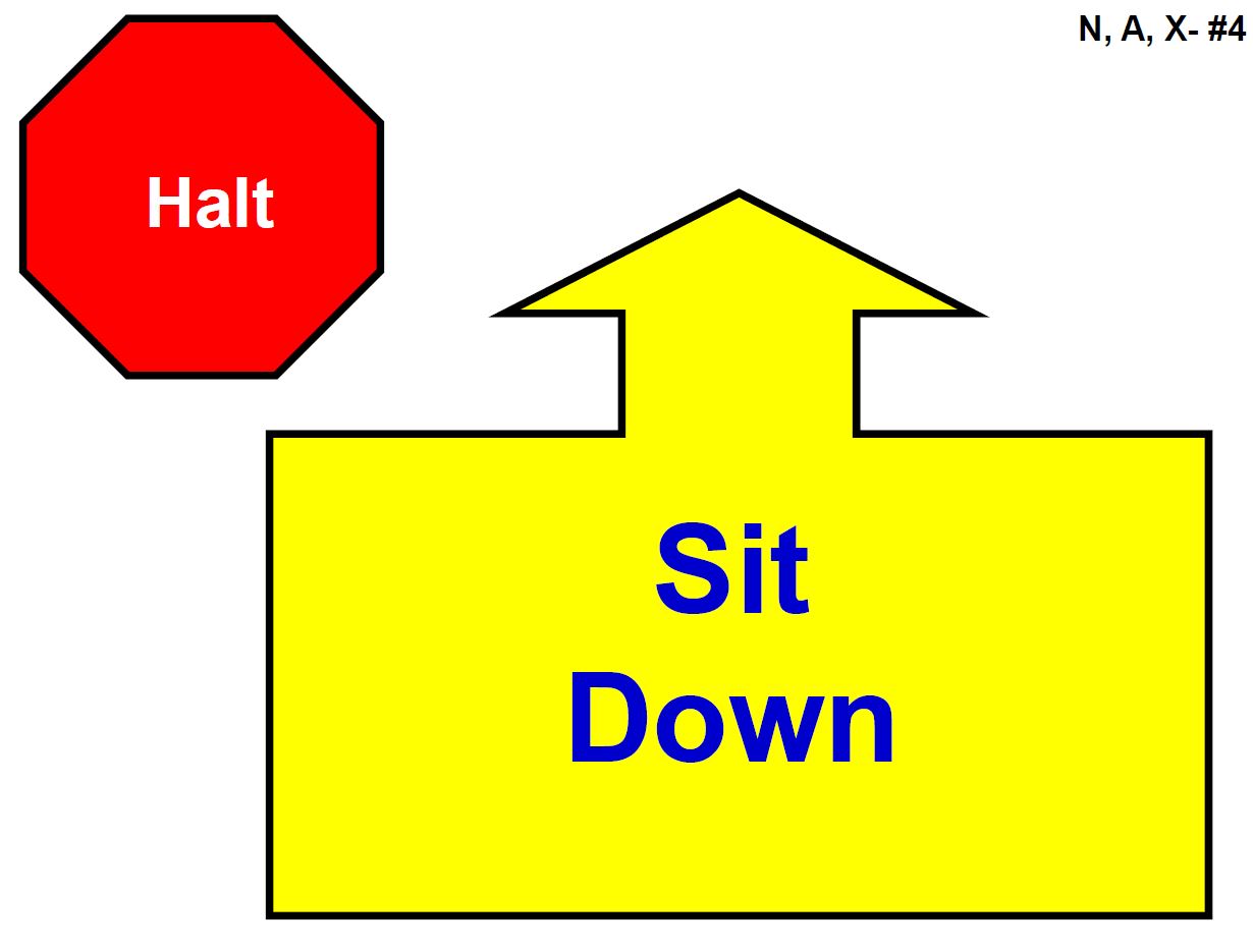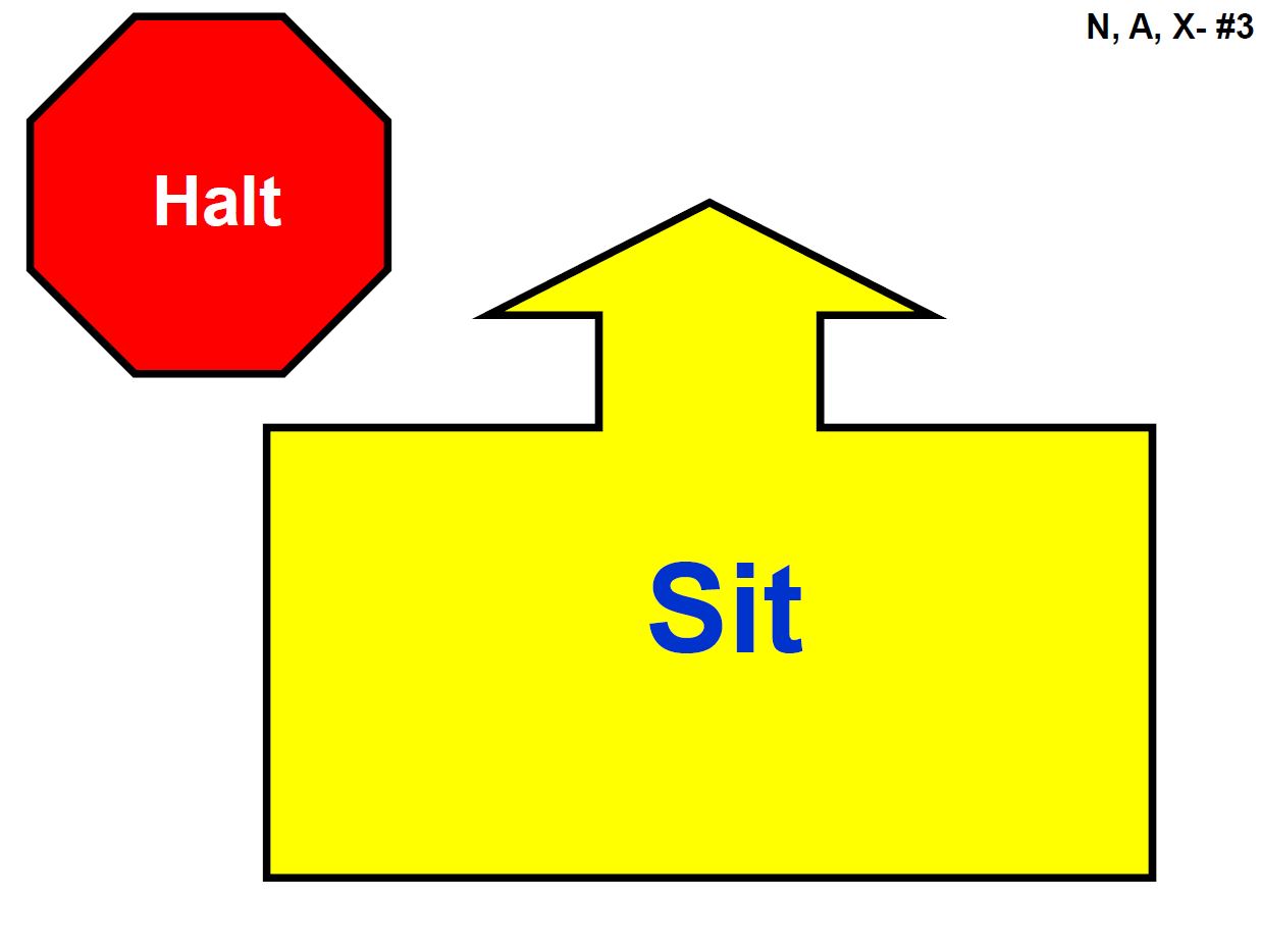 | While heeling, the handler halts and the dog sits.  The handler then commands and/or signals the dog to down, followed by the command to heel forward from the down position.  (Stationary  Exercise) |