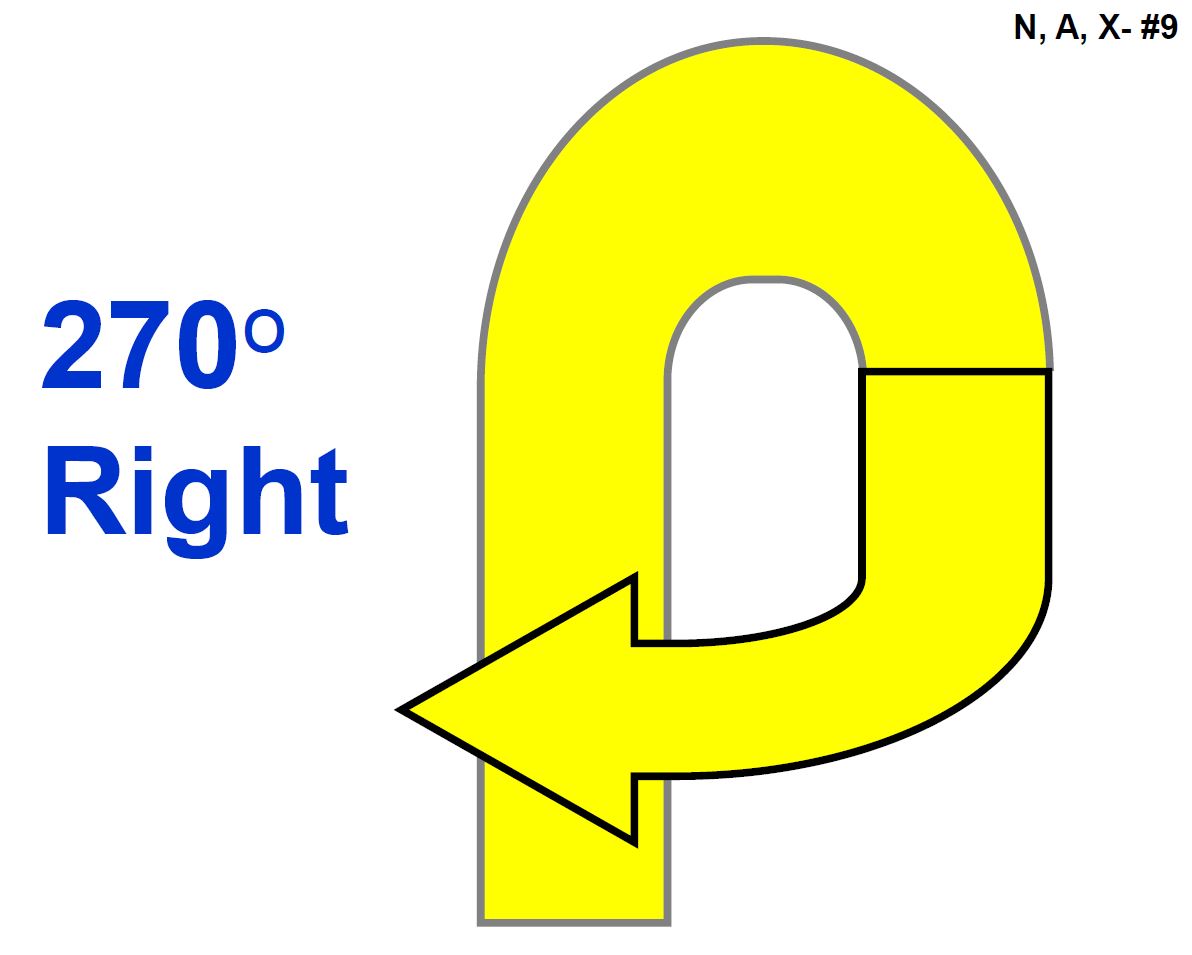 | While heeling, the team makes a 270° turn to the handler’s right. 270° turns are performed as a tight circle, but not around the exercise sign. |