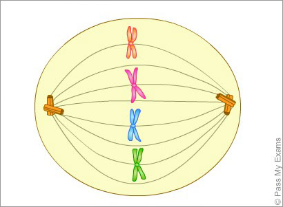 metaphase | spindle fibers attach to each chromosome and chromosomes are aligned along the equator |