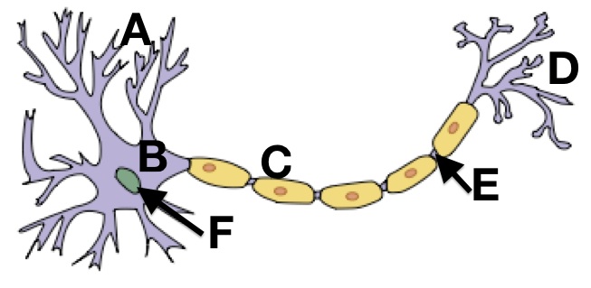 Part E of the neuron is the __. (study all parts of neuron),  | axon |