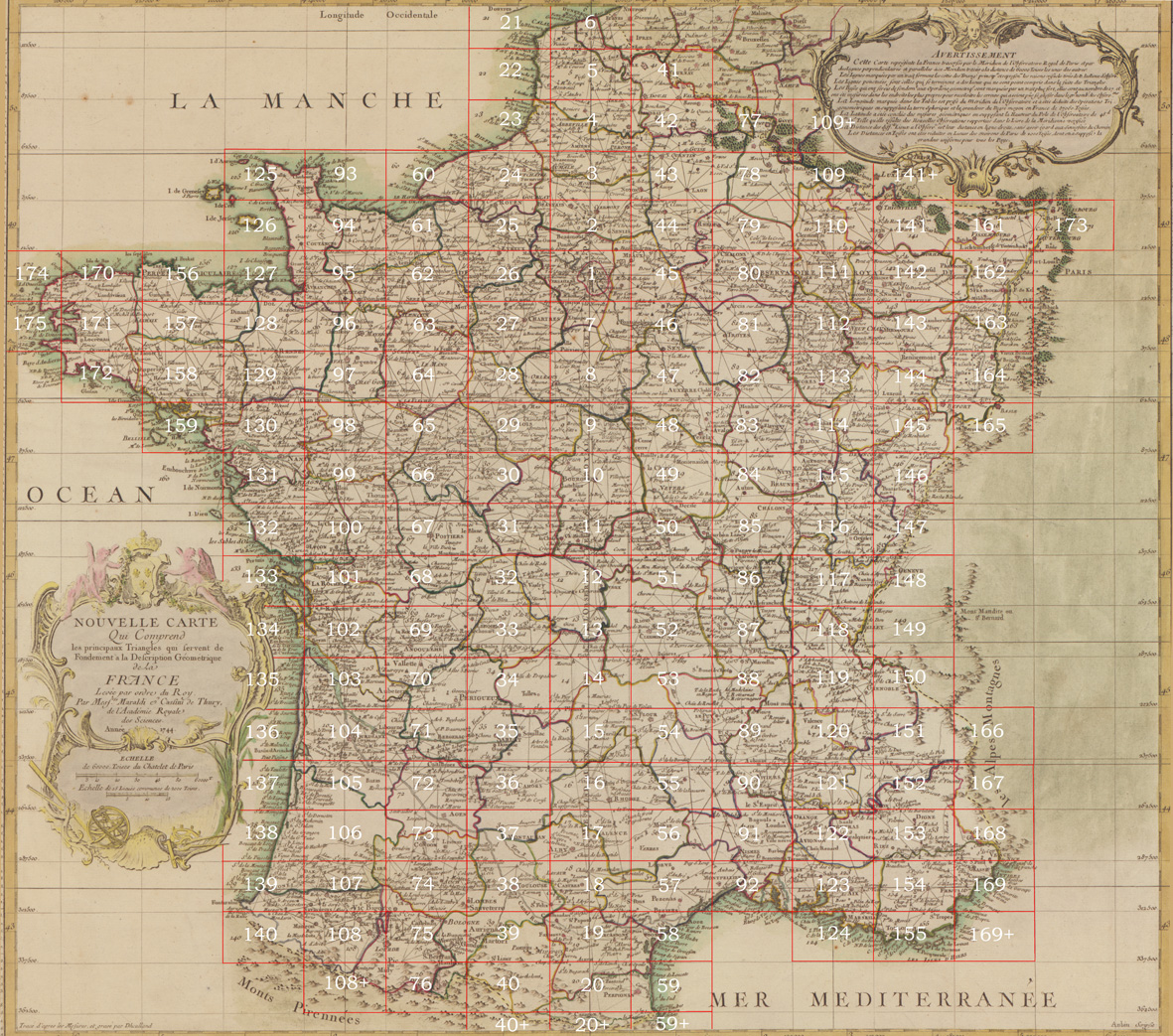 Cassini's Map of France,  | Starting under the reign of Louis XIV, four generations of the Cassini family made the first attemp to survey and map every meter of France. The Cassinis used the science of triangulation to create this 200-sheet topographic map. The map was nationalized in the late 18th century. The map was completed in 1744. |