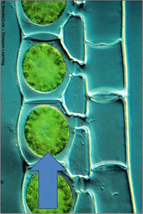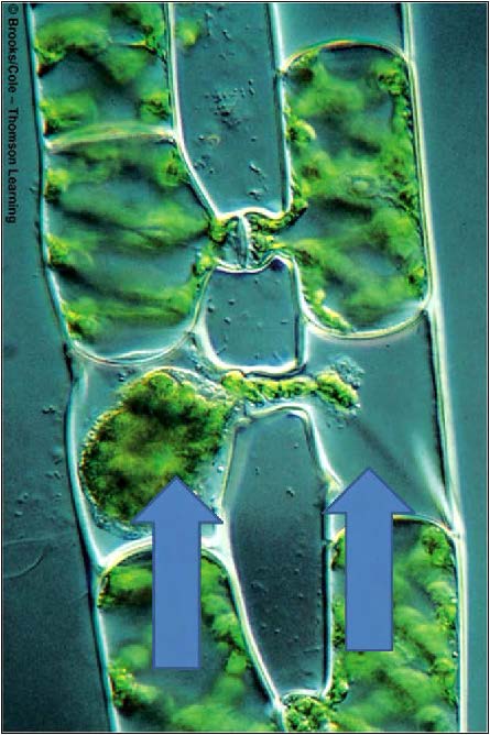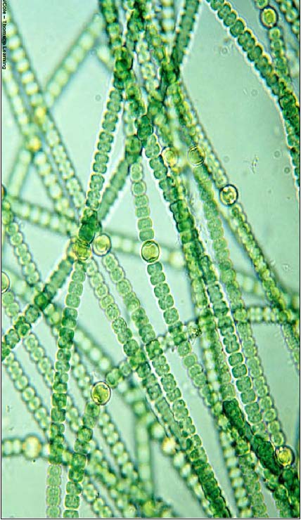| Anabaena - domain Bacteria, phylum Cyanobacteria, have nitrogen-fixing heterocysts, like chloroplasts, produce oxygen gas |