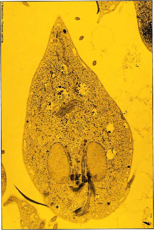 | Domain: Eukarya, Superclade: Excavata, Name: Trichomonas vaginalis, STD, non-functional mitochondria, flagella and undulating membrane move it along mucus-coated tract |
