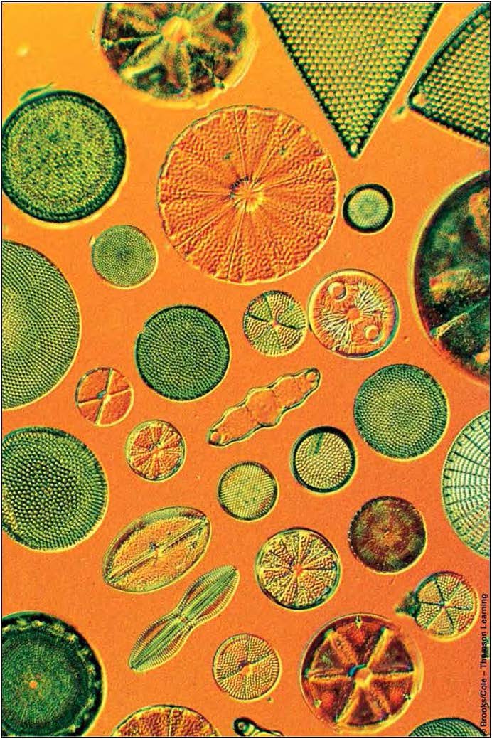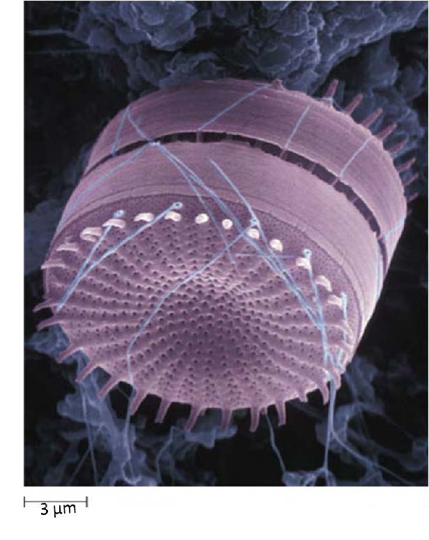 | Domain: Eukarya, Superclade: SAR, Clade: Stramenopiles, Name: Diatoms, Have one smooth flagellum, have one tinsel flagellum, have silica shells, pillbox shape, make up diatomaceous earth |