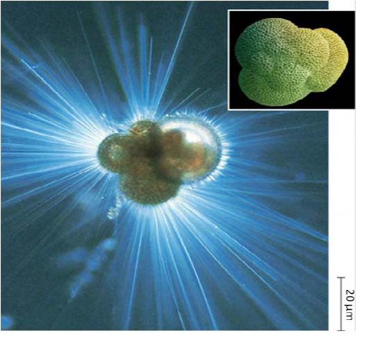 | Domain: Eukarya, Superclade: SAR, (Rhizarians), Clade: Cercozoa/Radiolarians, Name: Globigerina, Thread-like pseudopodia, calcium carbonate shells or tests, feed by extending pseudopodia through pores in their tests |