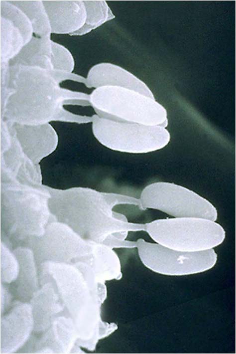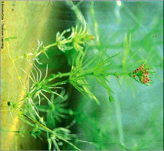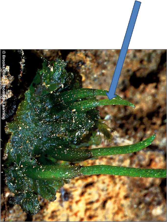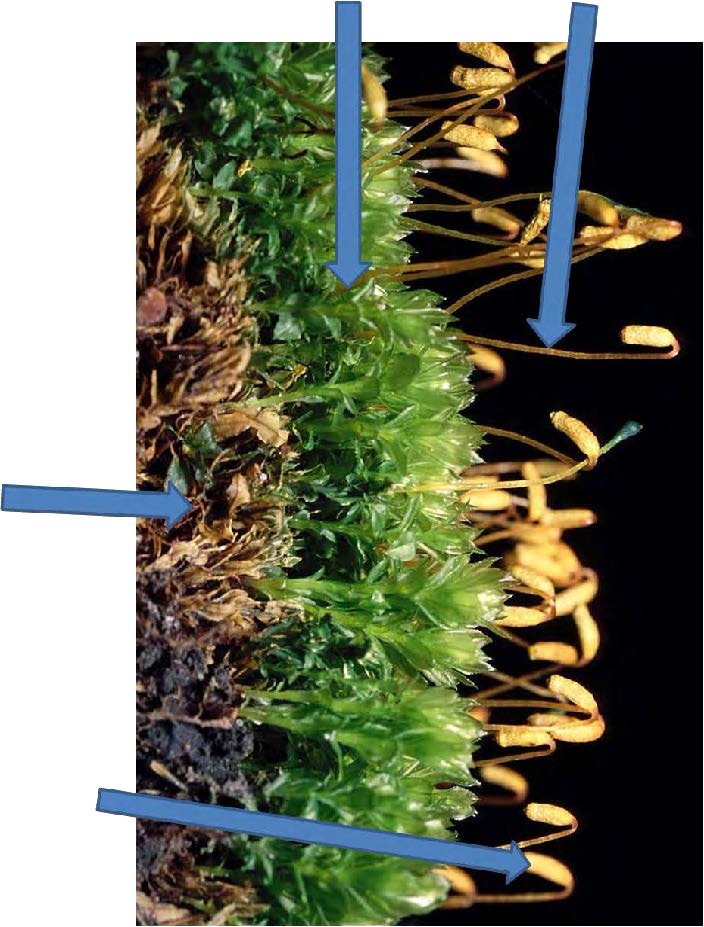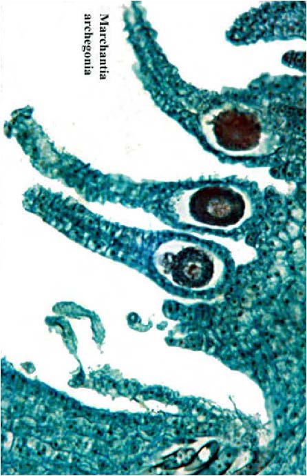 | Domain: Eukarya, Superclade: Archaeplastida, Derived homology: Bryophytes, Name: Mosses, SHOWS female archegonia that contains egg to be fertilized as sperm from male antheridia swim down neck |