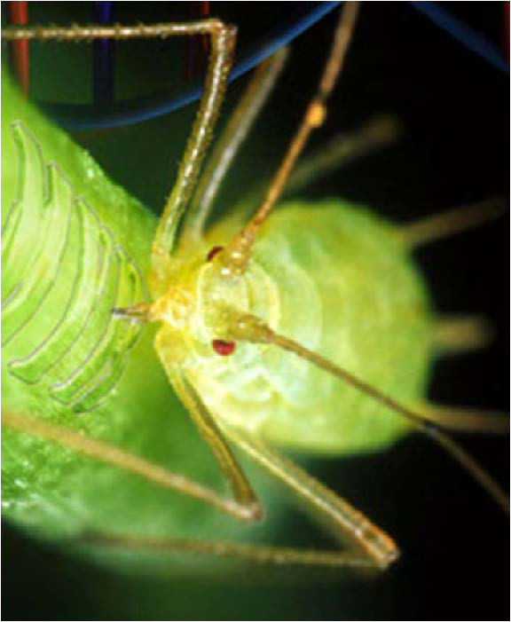 | Aphid (Homoptera), have 60-80 huge cells called bacteriocytes - filled with mutualistic bacteria, 200 million years of co-evolution, bacteria are maternally transmitted to eggs and embryos, neither bacteria or aphid can reproduce independently, each has streamlined genome and elimnated genes present in the other (bacteria may be B. aphidicola) |