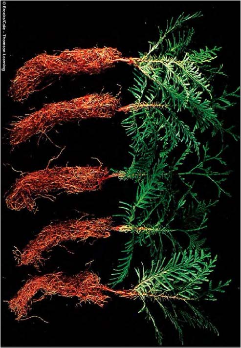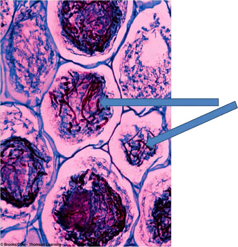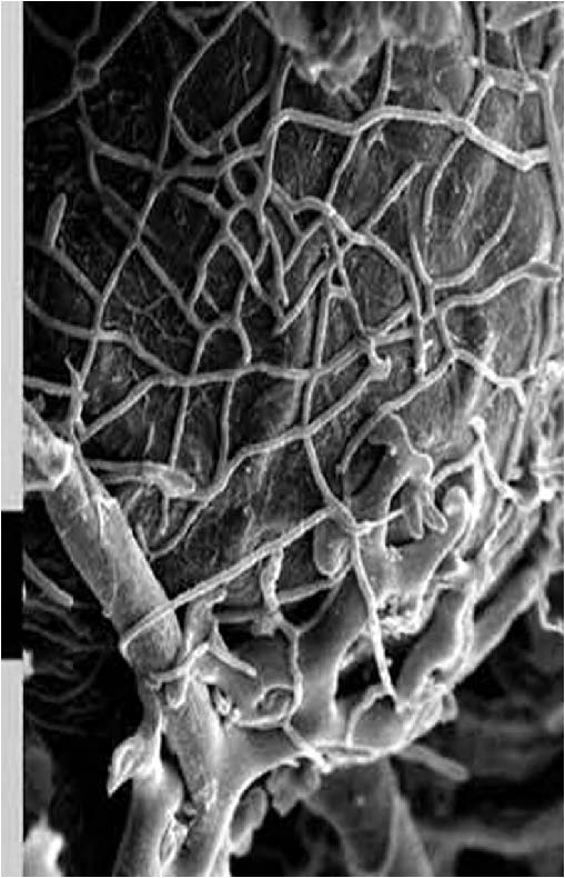 | bottom left corner: fungal hypha between plant cells, bottom right: sheath of fungal hyphae encircling root |