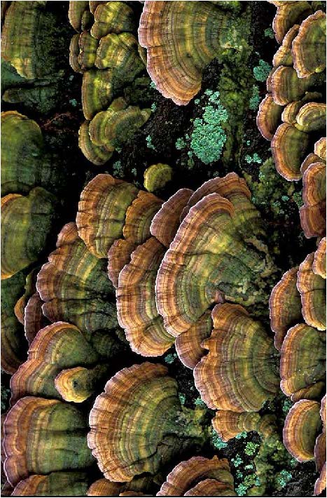 | Domain: Eukarya, Superclade: Unikonta, Clade: Opisthokont, Phylum: Basidiomycota, Name: Turkey Tall Shelf Fungus, club fungi |