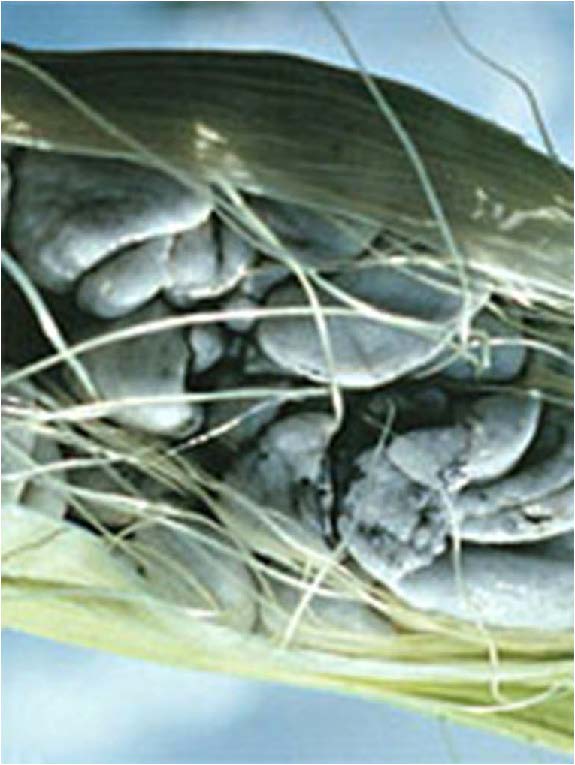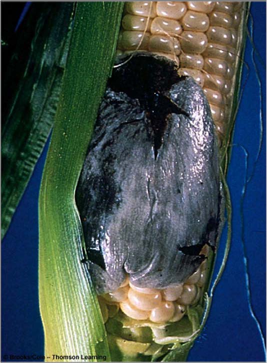 | Domain: Eukarya, Superclade: Unikonta, Clade: Opisthokont, Phylum: Basidiomycota, Name: Corn smut (Ustilago maydis), club fungi |