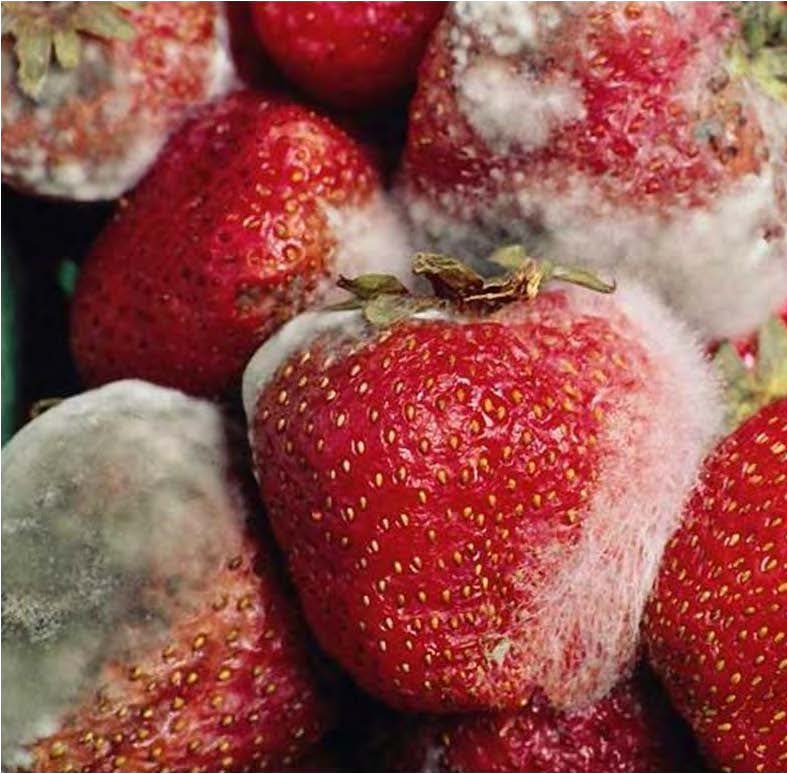 | Domain: Eukarya, Superclade: Unikonta, Clade: Opisthokont, Name: Rhizopus, causes food spoilage on stored food, such as strawberries (shown), bread, grapes, other berries, and grain |