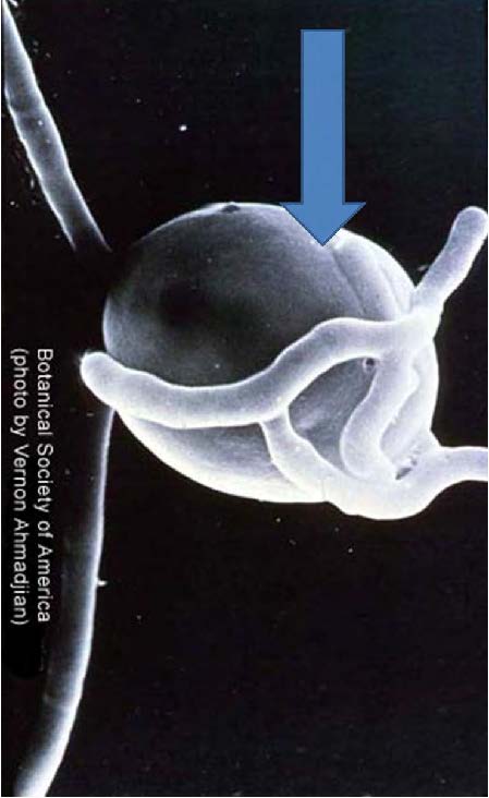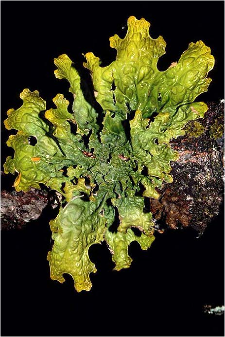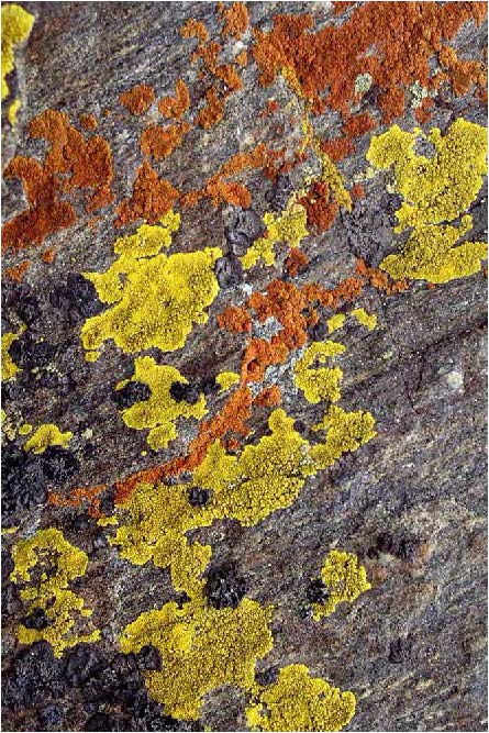 | shows lichen which is a mutualistic association of millions of photosynthetic cyanobacteria held in a mesh of fungal hyphae |