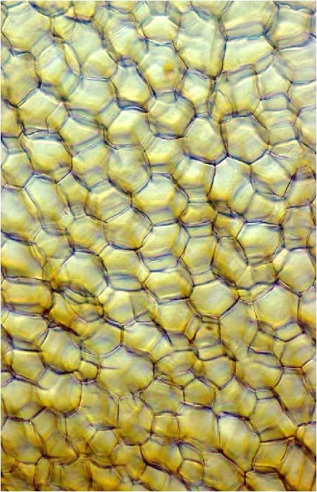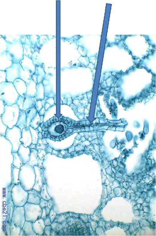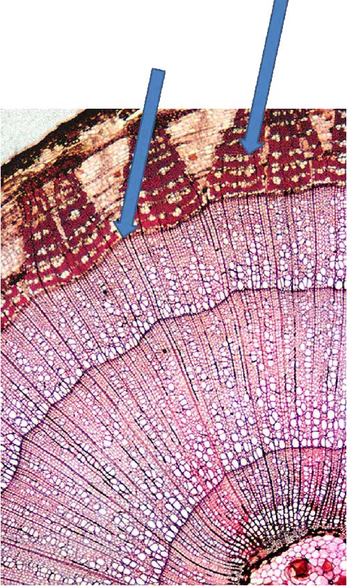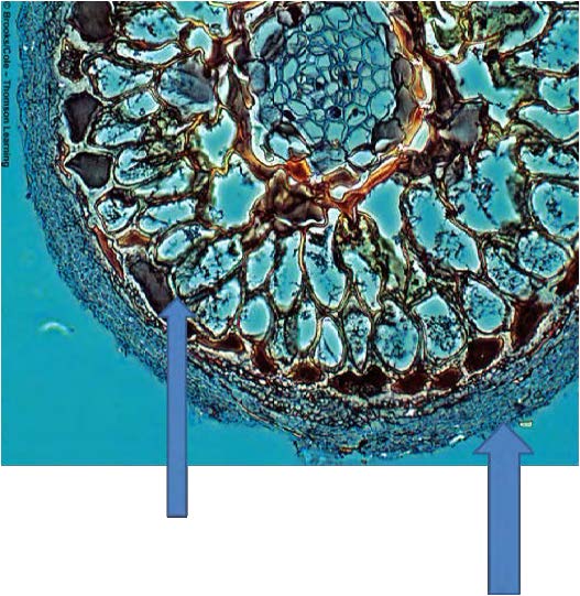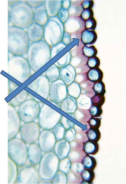 | shows epidermal cell covered by a cuticle; arrows pointing to collenchyma |