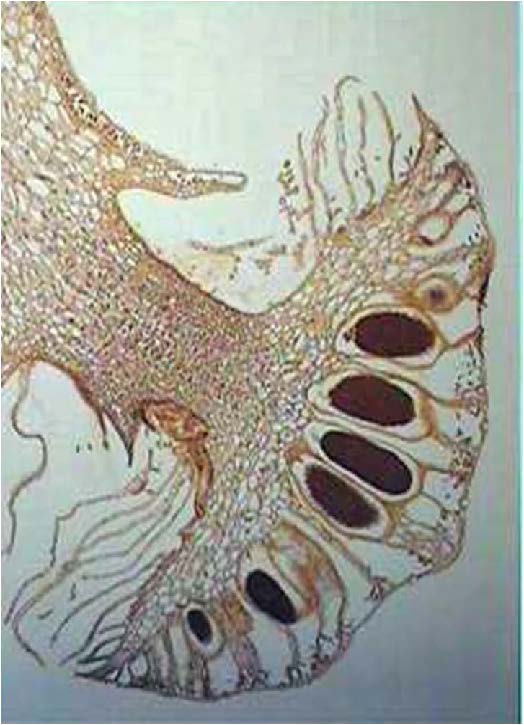 | Domain: Eukarya, Kingdom: Plantae (superclade Archaeplastida), Derived homology: Pteridophytes, Name: Whisk fern, Facts: Seedless vascular plants, true leaves, stems, and/or roots, sporophyte dominant, leaves can be tiny microphylls with one vein or megaphylls with many veins. SHOWS sporangium of Psilotum - Whisk Fern that contains haploid spores |