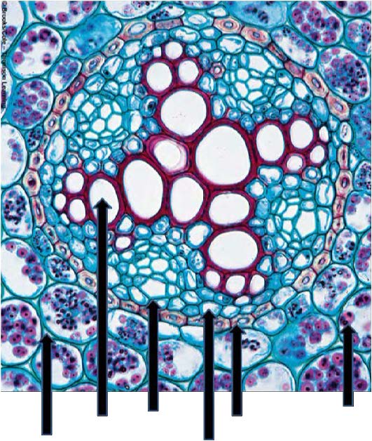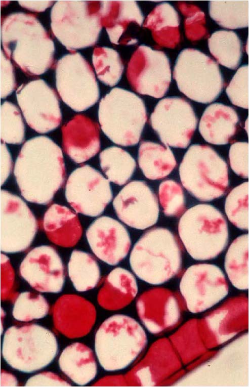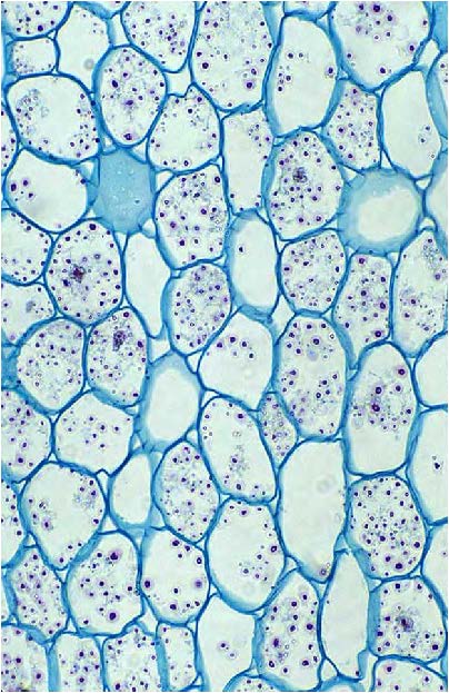 | from left to right: intercellular space, xylem vessel elements, phloem bundles, pericycle cell, endodermis cell, cortex cells - filled with amyloplasts (starch grains) |