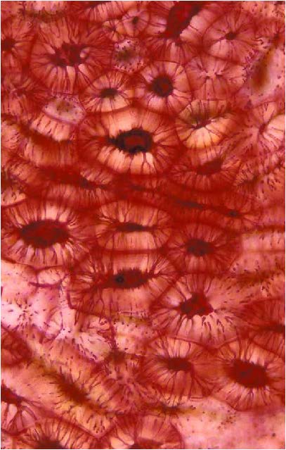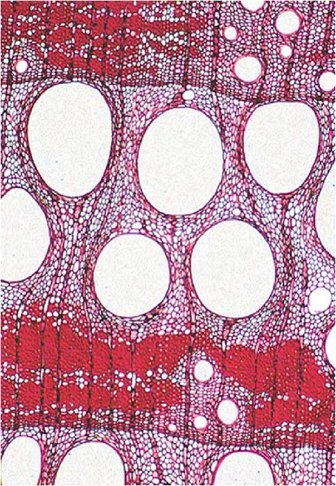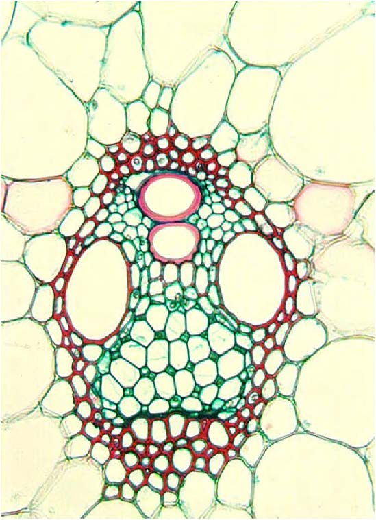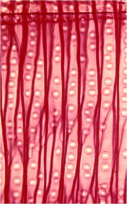 | shows tracheid vascular tissue; it is long, thin, and dead; tissue deals with water and sugar transport |