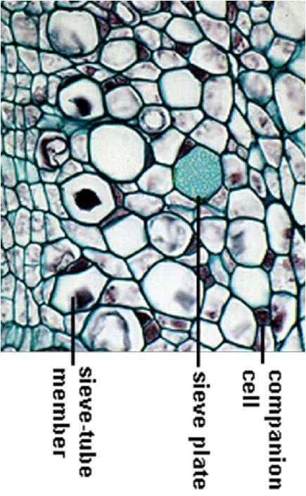 | shows sieve tube of vascular tissue; it is living but has no nucleus; deals with water and sugar transport; arrows from top to bottom: companion cell, sieve plante, sieve-tube member |