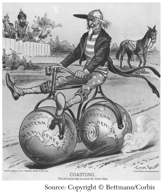 In this cartoon published in 1898, Uncle Sam rides a bicycle with tires labeled “western hemisphere” and “eastern hemisphere,” while a horse whose saddle reads “Monroe Doctrine” waits in the background. The basic message of the cartoon is:,  | The Monroe Doctrine has been left behind. |