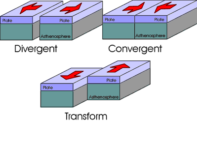 tectonic plates | form sections of the surface of Earth, and some plates move toward (convergent) or away (divergent) from each other. Plates can also slide (transforming) past each other |