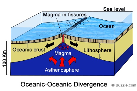volcanoes | destructive forces; created by divergent boundaries under water or convergent boundaries on land,  |