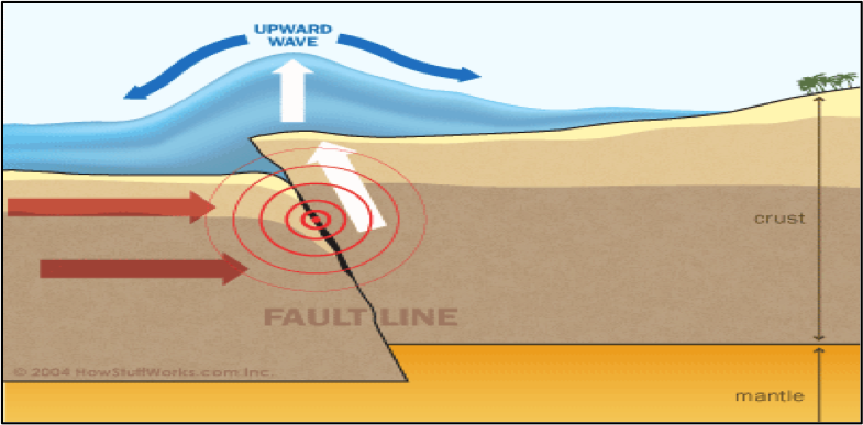 Tsunamis | energy released by an earthquake or underwater volcano is transferred to the column of water above it and creates waves that travel away from the area.,  |