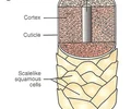 | hair cuticle | the transparent outer protective coating of hair,  |