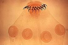ROSTELLUM,  | The head of a tapeworm with hooks allowing the tapeworm to attach to its host. |