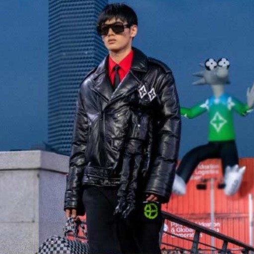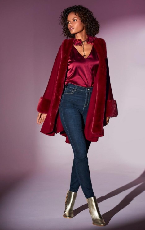 | Elle porte un manteau rouge, un jean bleu, et des bottes métalliques. |