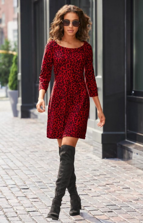 | Elle porte une robe rouge et noire, des bottes noires et des lunettes de soleil. |
