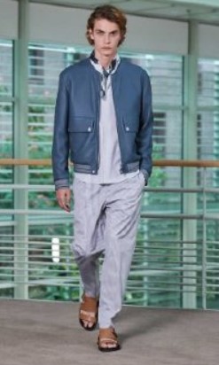 | Il porte un pantalon gris, une chemise blanc, un blouson bleu, et des sandales. |