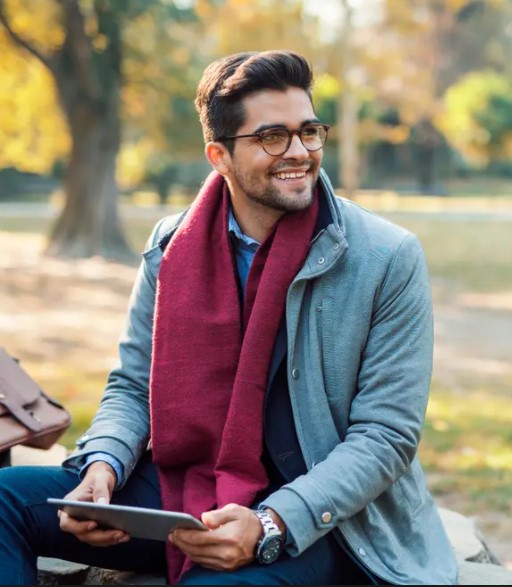 | Il porte un foulard, des lunettes et une montre. |