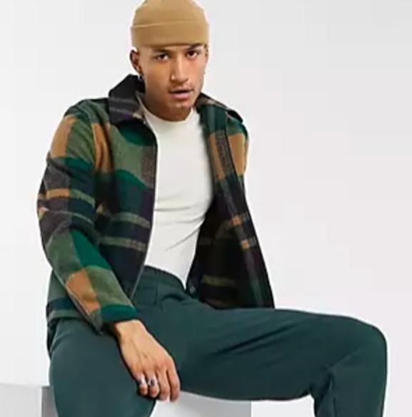 | Il porte une tuque beige, un tee-shirt blanc, une chemise à carreau et un pantalon de jogging vert. |