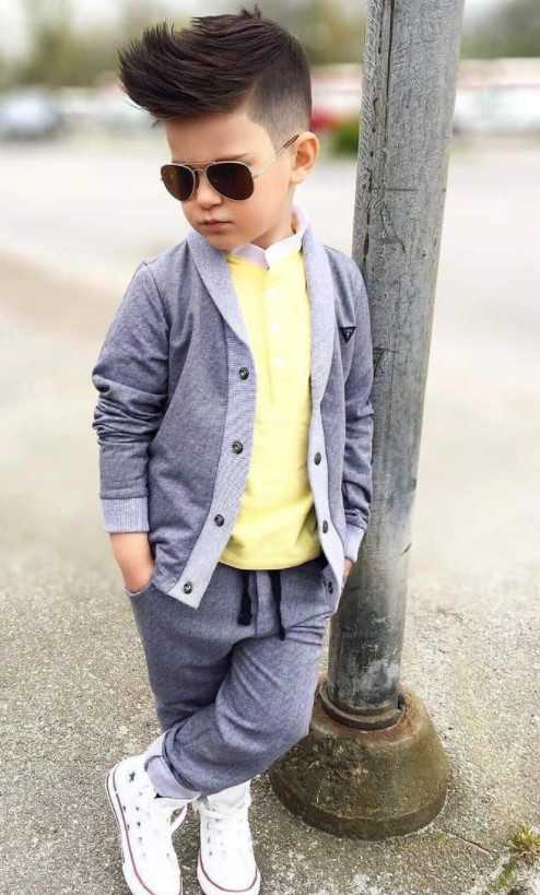 | Il porte une chemise jaune, un gilet gris, un pantalon gris, des baskets blancs, et des lunettes de soleil. |