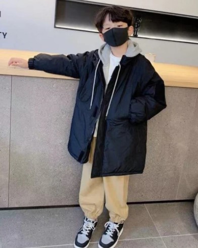 | Il porte un manteau vert et une tuque bleu. |