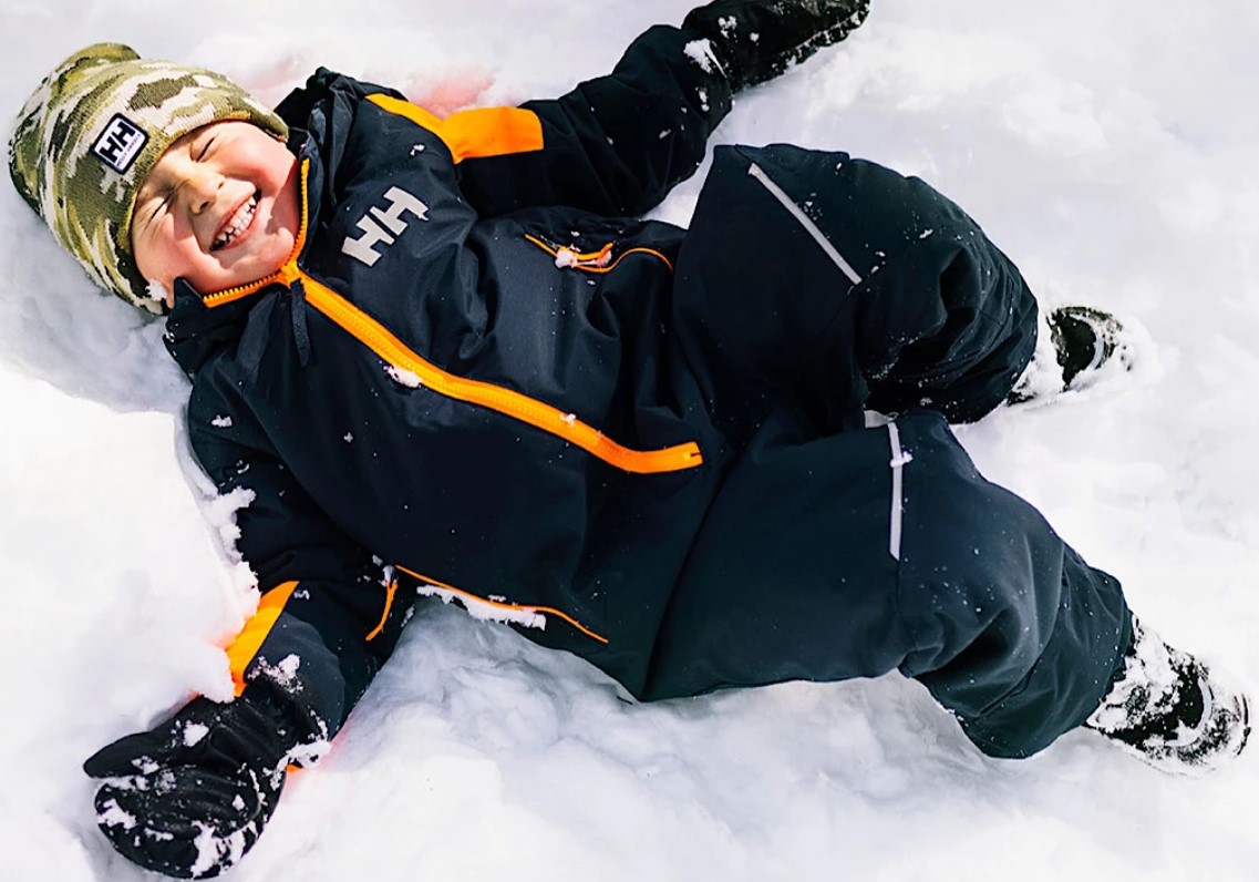 | Il porte une tuque, des bottes et un costume de neige. |