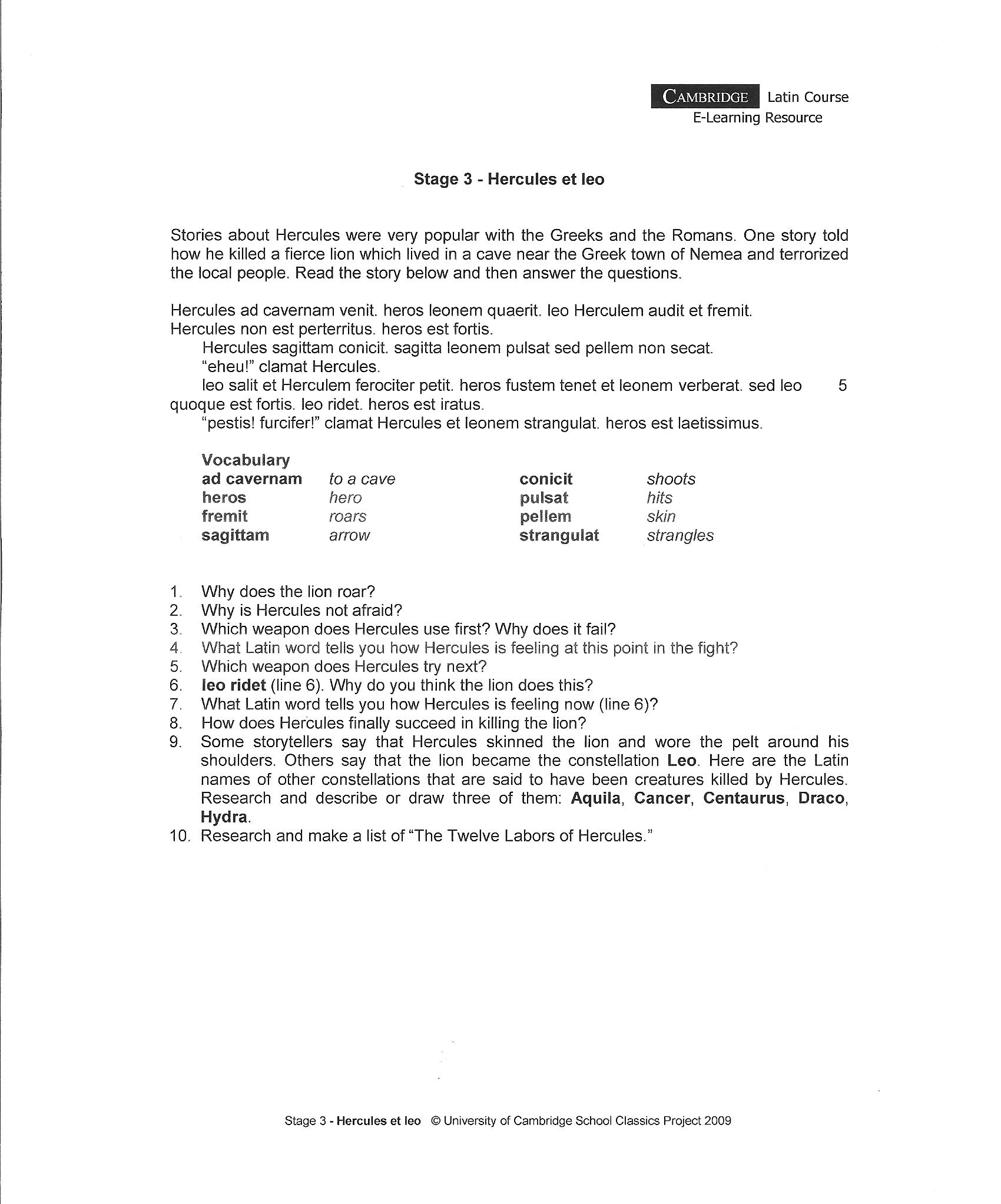 11. READ and ANSWER the questions on Hercules et leo [click on link] (story also passed out in class)