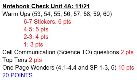 In Class: Taste Lab GRACE; Wonders/NB due. Take the Unit 4A MCQ and FRQ tests.