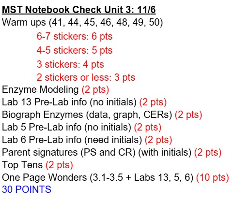 - Notebooks and Wonders due Thursday. Wonders for Unit 3 include 3.1-3.5 and Labs 13, 5, and 6.