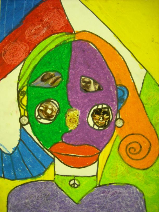5th Grade Picasso portraits (not necessarily self-portraits!). Students combined the front view and side view of faces into one face the way Picasso did. We collaged some of the facial features from magazines, then used pastels to finish off the work, and came up with some wonderful masterpieces of our own!