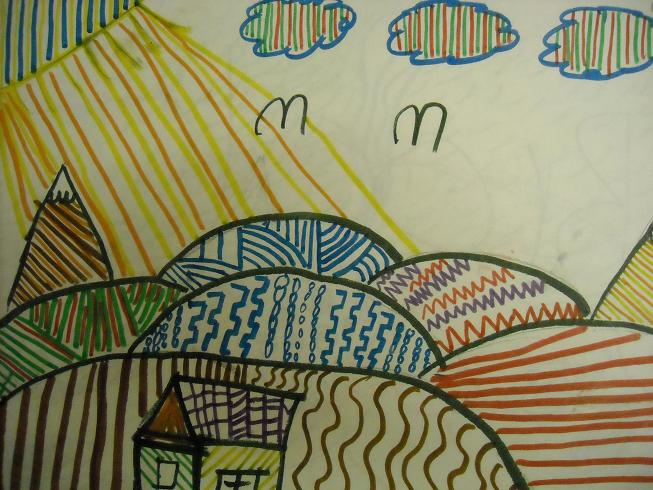 We started the year learning about the first element of design--line, and created line landscapes. First, students outlined shapes of mountains, hills, and fields, and filled in each shape with a variety of lines. Lines were repeated to create patterns.