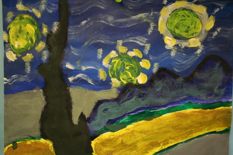 VAN GOGH (2009) ~ Fifth graders chose one of Vincent Van Gogh's paintings and painted their own version of it, making TINTS by mixing white paint with a color, and SHADES, by mixing black paint with a color. They painted the background first, then mixed colors and used short brush strokes to create texture in Van Gogh's style.