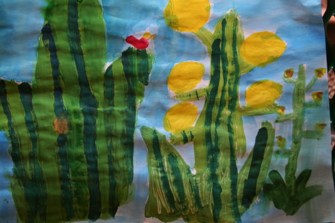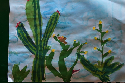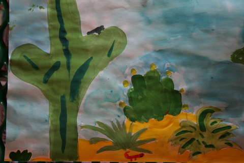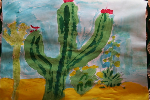 Second graders have studied line and drawn line animals, learned about color and used oil pastels to color a color wheel, created and decorated with Indian designs clay pinch pots, painted a Christmas tree, chose a Catholic Icon to draw then paint, painted a desert scene focusing on desert plants, learned about artist Georges Seurat and Pointillism, and practiced drawing three-dimensional forms which satisfied the following Diocesan standards: Strand 1, C-1, PO-a (line in art), b, (color in art), and d, (form in art) C-3, PO-1 (drawing), PO-2 (painting), PO-3 (printmaking), C-4, PO-a (sculpture). Also, Strand 2, R-1, (understand and appreciate the place of art as it reflects our Catholic beliefs) and Strand 3, E-1, PO-a (explore relevancy to Catholic faith). C-5, PO-a, PO-b (safety and care of art materials); Strand 2, R-1 (understand place of art in historical and cultural context).