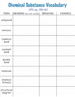 - For each term -- element, compound, mixture -- write a list of criteria for determining if a substance can be classified as such (e.g. How would you KNOW something is an element?), then draw an example (see CPO pg. 158 for help).