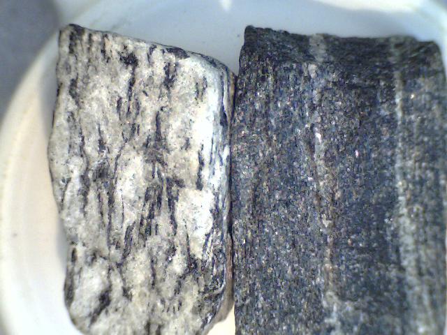 Gabbro and Harzburgite are also very similar. They are both intrusive and both mafic. Harzburgite has more of a mineral called olivine. Olivine is green. Harzburgite will have a greenish tint. Harzburgite also weathers to a rusty reddish-brown color. Gabbro will not have a greenish tint and it weathers to more of a beige or tan color.