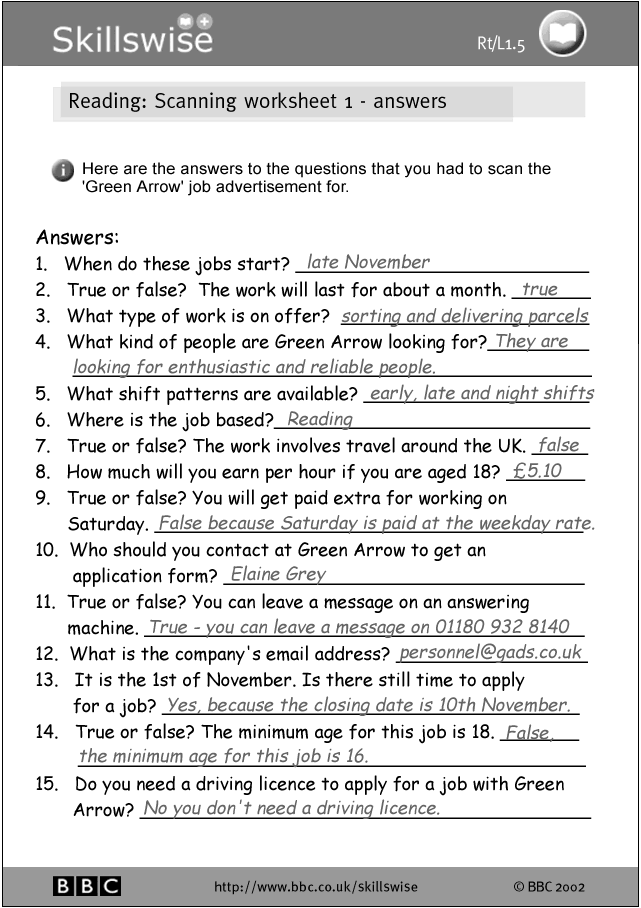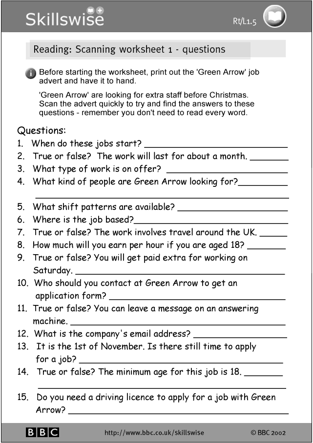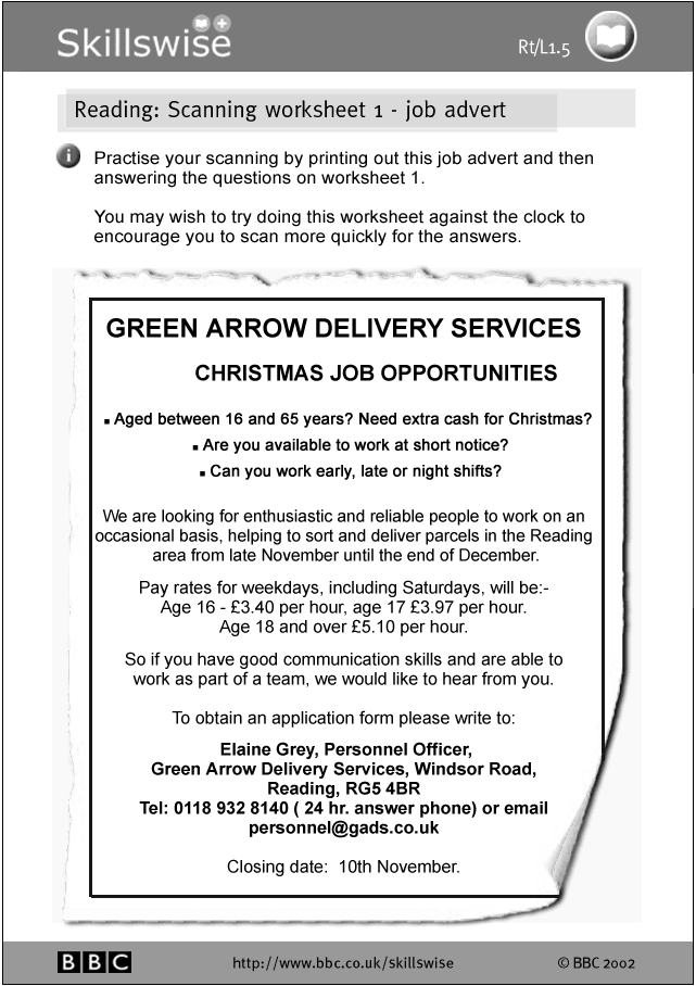 Job Advert Scanning Task - from the BBC Skillswise website.