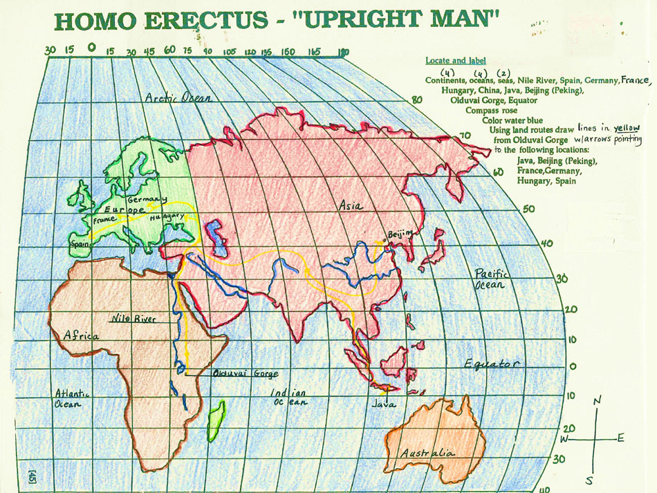 Read and study the following passage about Homo Erectus. Then go to the Quia game links and play first the vocabulary game then the review game. Take the Quia Quiz. When you have successfully answered all the questions in the games and quiz, you will enter the Inspiration site and complete/study the outline for Homo Erectus. The outline will become your "notes" for the final test. As we progress through this unit, you will complete more and more of the Inspiration outlines yourselves.