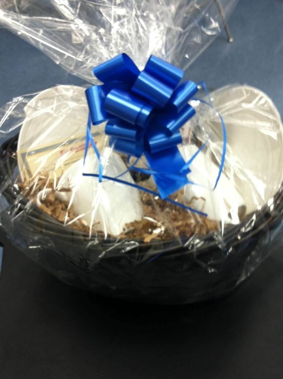 Gift basket from Anthony's Desserts. Consists of $25 gift certificate, Anthony's Dessert blend coffee, two white coffee mugs, and two white dessert plates